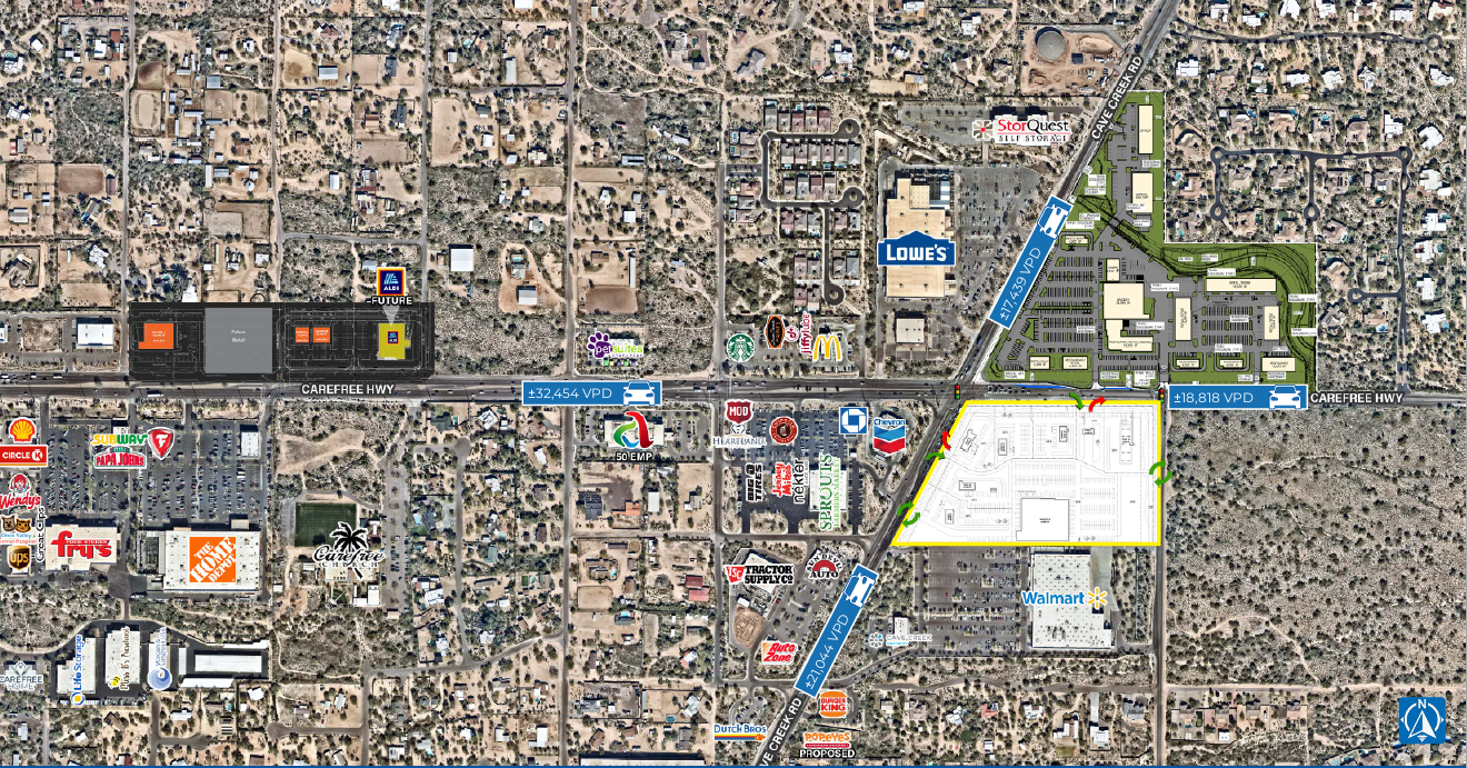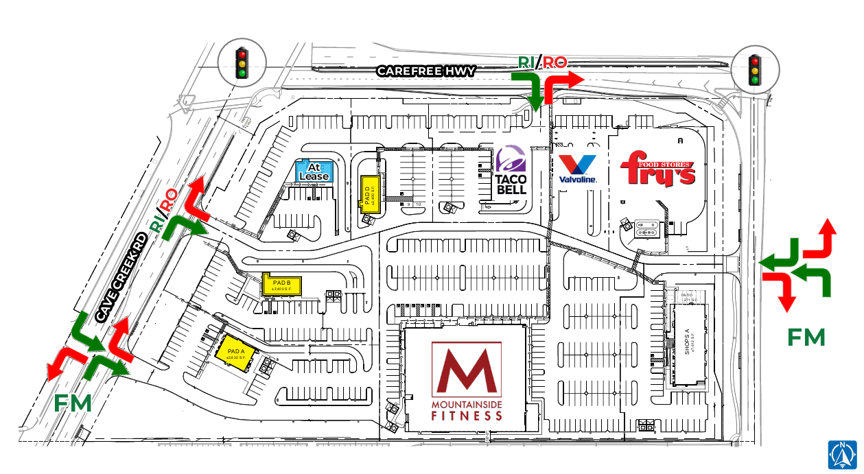 High profile pads available for ground lease at Evergreen’s newest Mountainside Fitness anchored shopping center in Cave Creek!  Located at the southeast corner of Carefree Highway and Cave Creek Rd, the most dominant intersection in the trade area boasting over 200,000 SF of GLA including Walmart, Lowe’s and Sprouts anchors. The City of Scottsdale is significantly improving Carefree Highway from Cave Creek Rd to Scottsdale Rd providing prime access to this site. Retail pads available with drive-thru, convenience, and automotive uses permitted.
