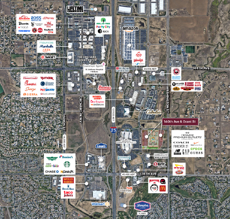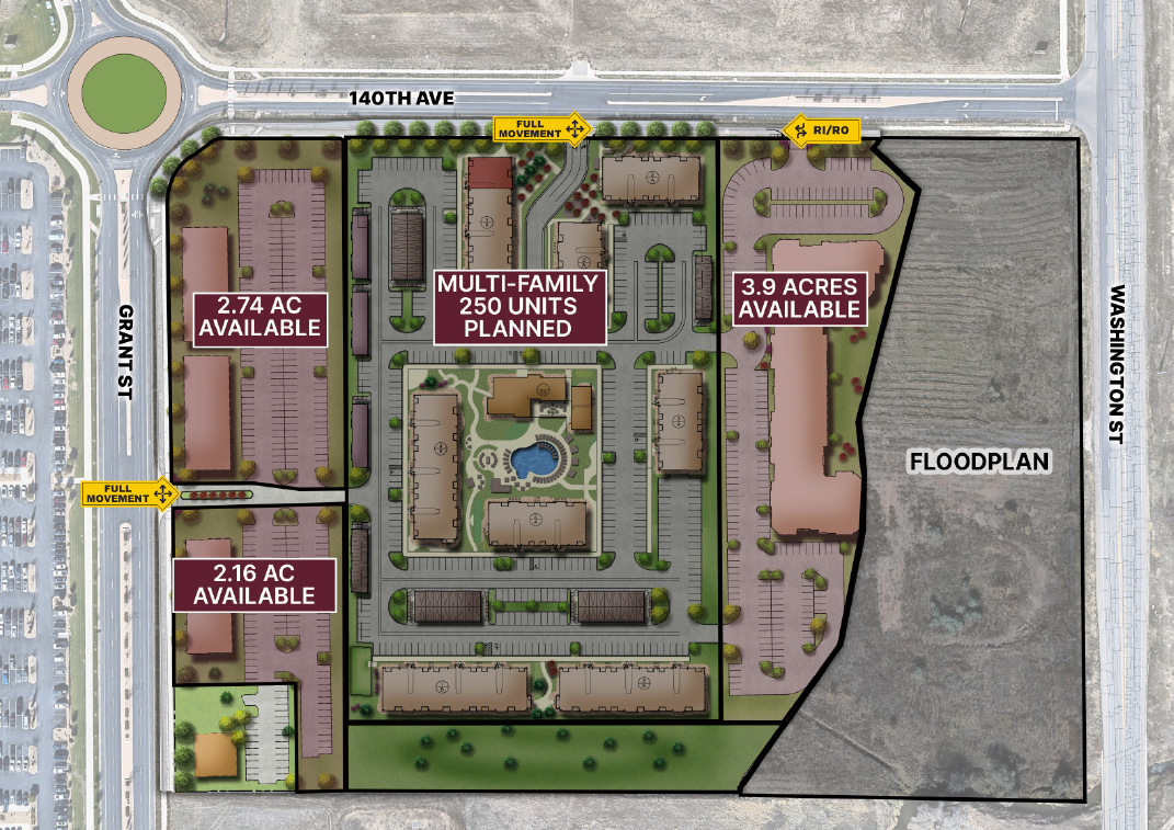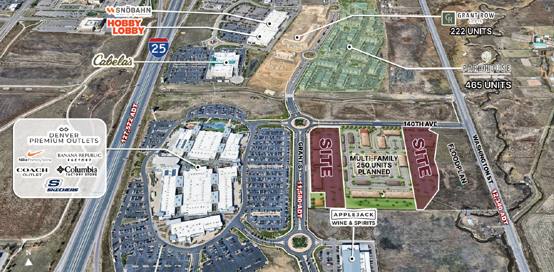 Commercial pads available and Senior Living opportunity in new mixed-use development across the street from The Denver Premium Outlet Mall in Thornton. Adjacent to 250 planned multi-family units in a high-income trade area.