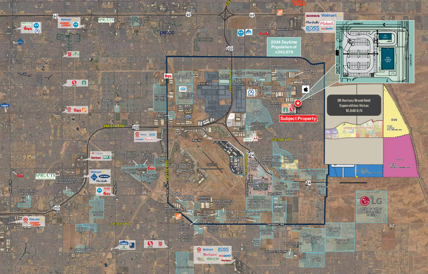 Located in the epicenter of the award winning Eastmark community. Adjacent to newly developed Safeway anchored shopping center. Accessible to 3 major freeways. Retail pad and shops space available.